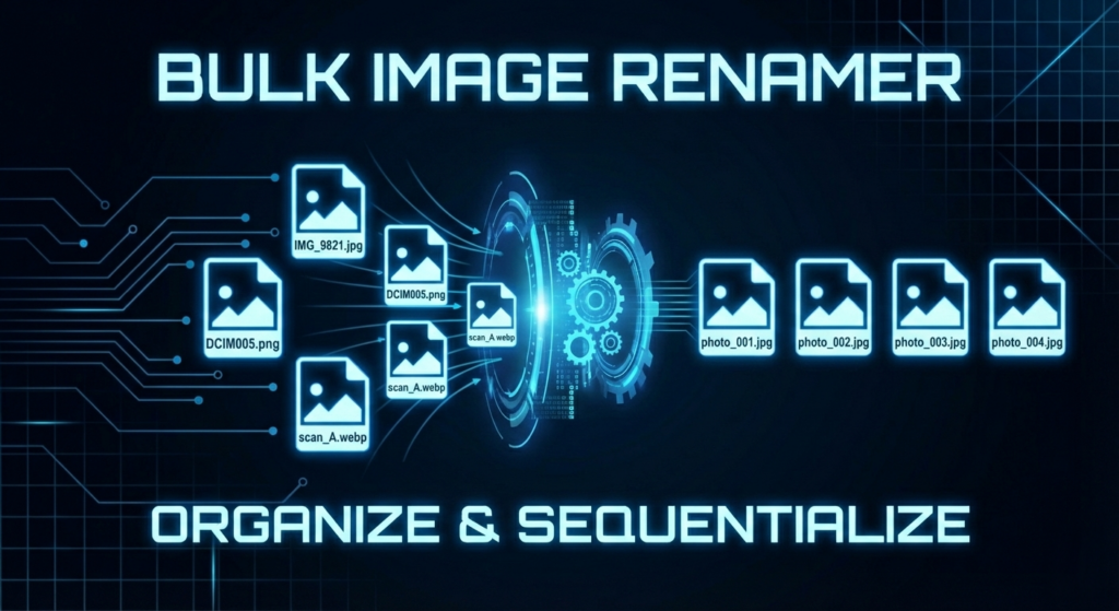 バラバラな画像ファイル名を、規則正しい連番名(例: photo_001.jpg)に一括変更。プレビュー機能付きで、安全に整理できます。